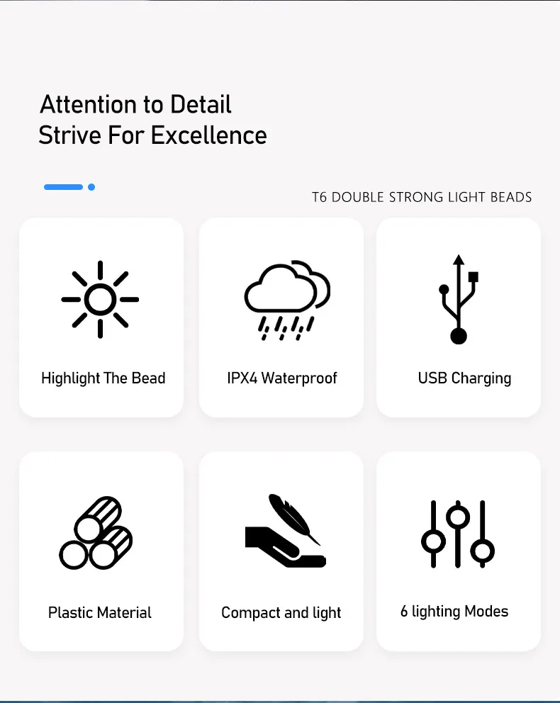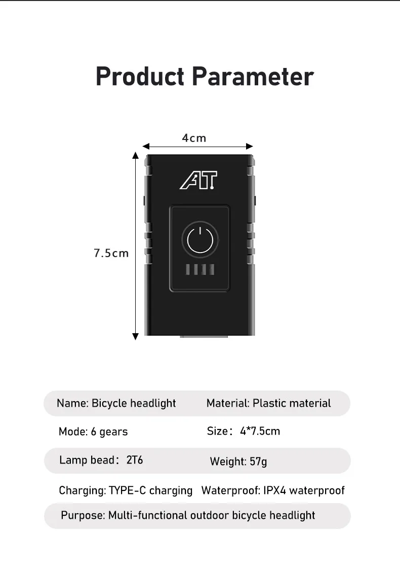 6 modos de iluminação LED Você tem seis modos de luz para escolher: luz brilhante T6 - luz fraca T6 - luz brilhante T6 - 2 * luz brilhante T6 - 2 * T6 sos - 2 * flash T6.Fácil de instalar E o passeio acabou, você pode removê-lo facilmente e levá-lo para casa