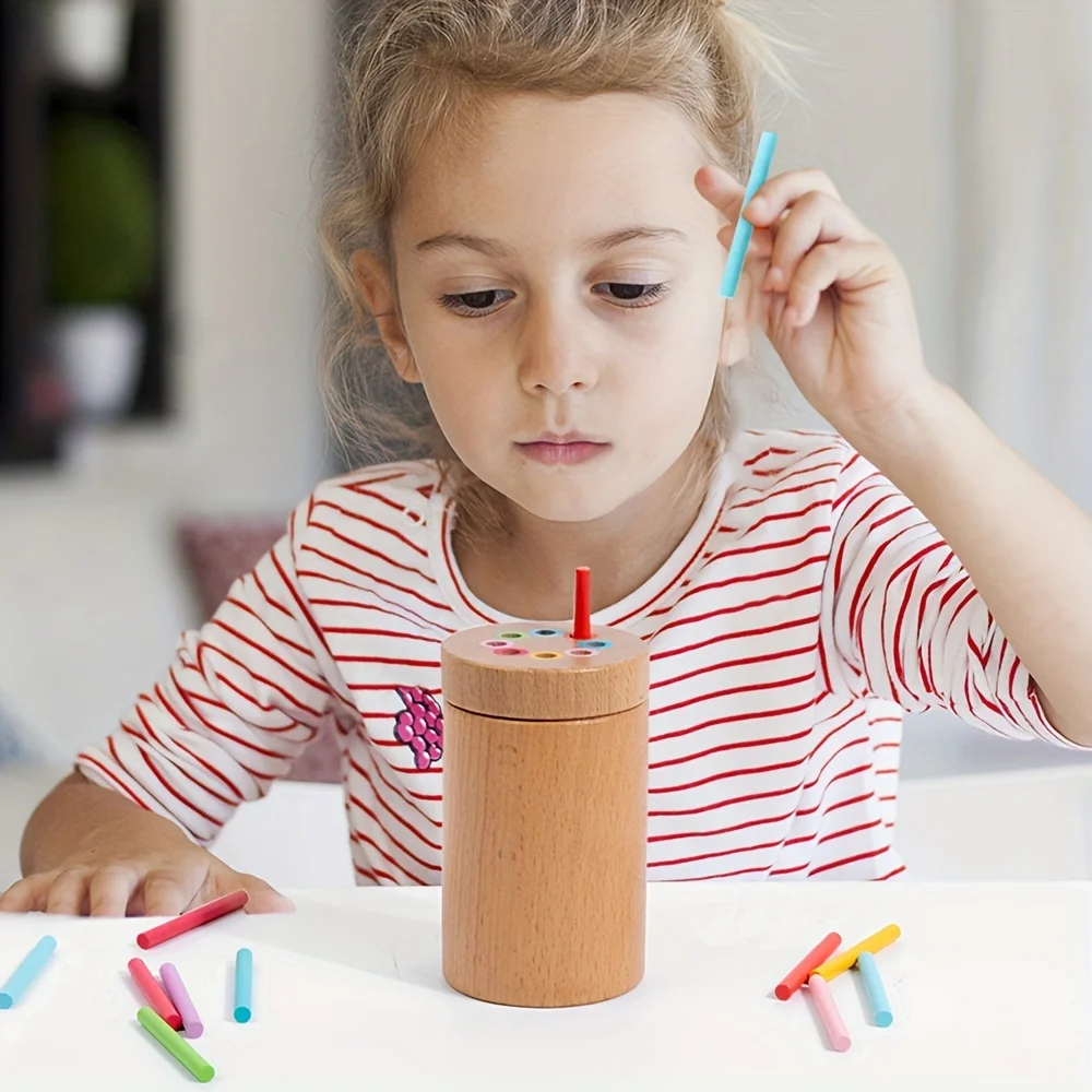 Tamanho simples de correspondência de produto: Este brinquedo Montessori de classificação de cores para bebês é muito adequado para viagens, combinação simples: 1 capa colorida, 1 balde cilíndrico, 16 palitos coloridos com embalagem em caixa colorida;o tamanho do cilindro é 6X10cm/2.36X3.94 polegadas e o tamanho do bastão é 0.5X5.2cm/0.2X2.05 polegadas.